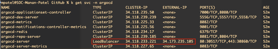 The key service is argocd-server (refer the screenshot below). If it’s ClusterIP, either port‑forward or switch to LoadBalancer to reach the UI.