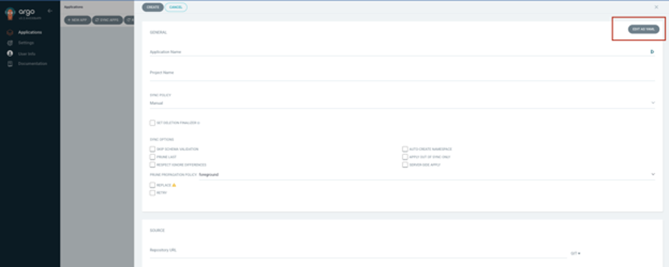 Again, go to the UI, click NEW APP → Add details of the application name → Edit as YAML and update the spec field as per the yaml below