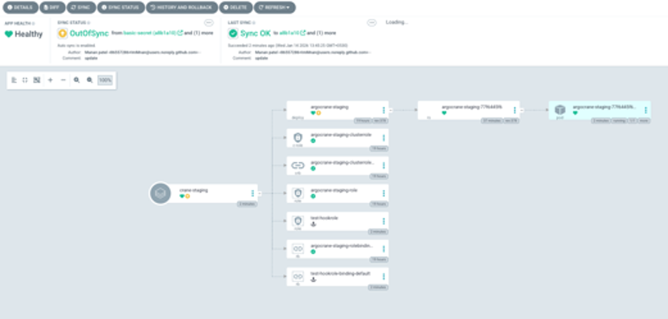 project: default destination: server: https://kubernetes.default.svc namespace: default source: repoURL: https://github.com/<your-username>/helm-crane.git targetRevision: main path: . helm: releaseName: argocrane-staging valueFiles: - values-staging.yaml syncPolicy: automated: prune: true selfHeal: true enabled: trueAfter creating the Application, if auto‑sync is enabled, Argo CD immediately deploys the chart with your values. Otherwise, click Sync in the UI and watch the resources come up.