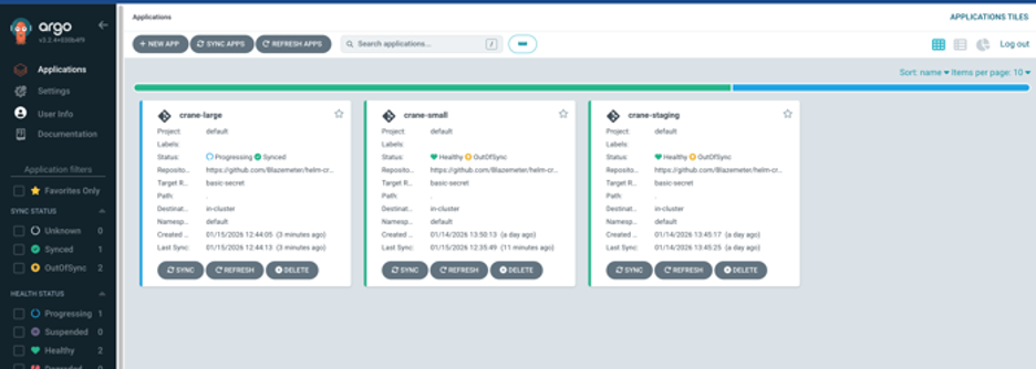 In my case, I created three Applications—crane-small, crane-staging, and crane-large—each pointing at a different values file. You can also split by environment (e.g., crane-dev, crane-staging, crane-prod) with different namespaces or clusters.