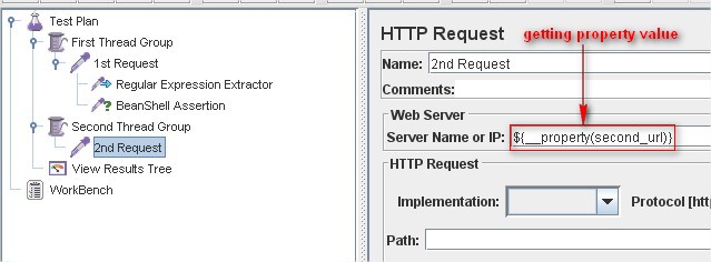 To access this value, let us look at the second request in the Second Thread Group. To increase the property value, we use another JMeter function: __property().