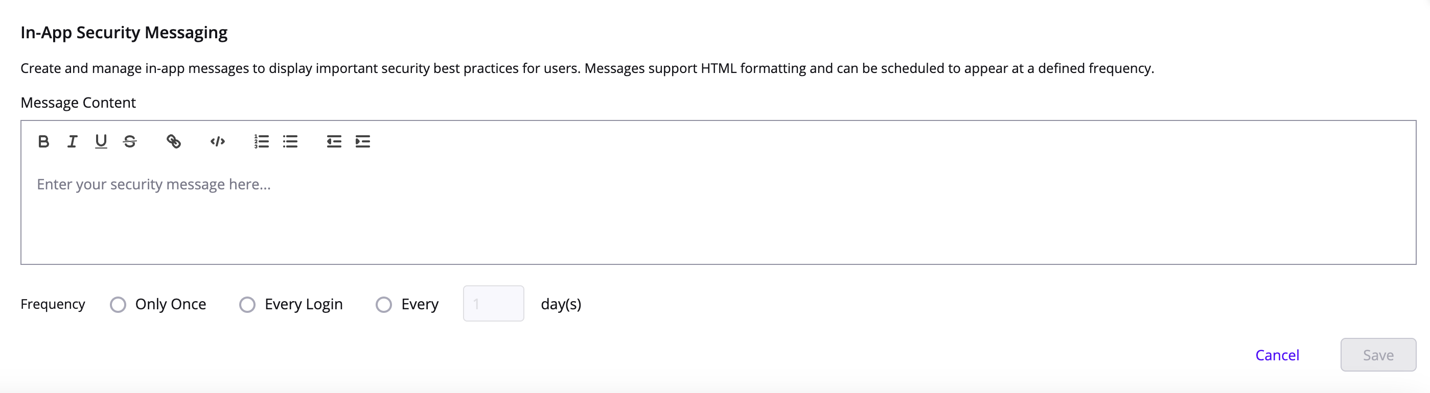 Account admins can create in-app messages and choose how often they are shown. Use messages to share best practices, announcements, or guidance with all users.