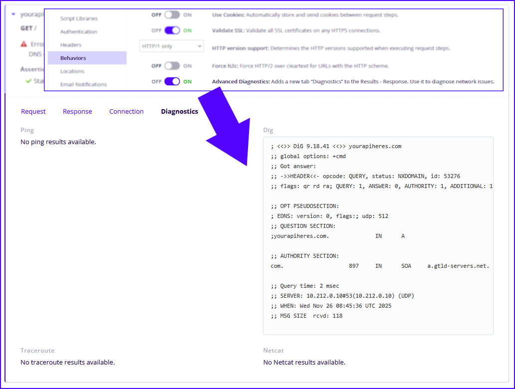 Advanced Diagnostics helps troubleshoot network issues during API tests. When enabled, a Diagnostics tab appears in Results > Response and shows real-time outputs for connectivity and performance checks. Turn it on in Test Settings > Behaviors by toggling Advanced Diagnostics, which is the last item. Default is off.